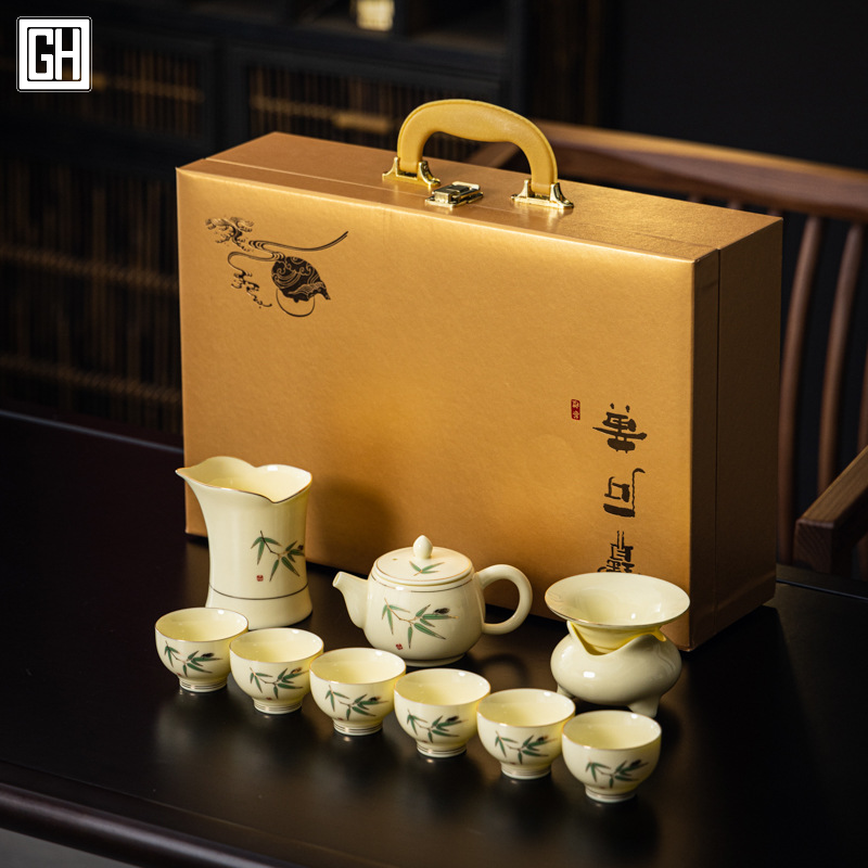 Tinh tế trong sắc men, giản dị ở đường nét, Bộ Trà Tre Như Diêu thể hiện đầy đủ tinh thần của trà đạo phương Đông. Bộ sản phẩm được chế tác thủ công từ gốm sứ phủ men cao cấp, mang sắc vàng nhạt nhã nhặn, điểm xuyết bằng họa tiết vẽ tay hình trúc – biểu tượng của chính trực và thanh cao trong văn hóa Á Đông.
