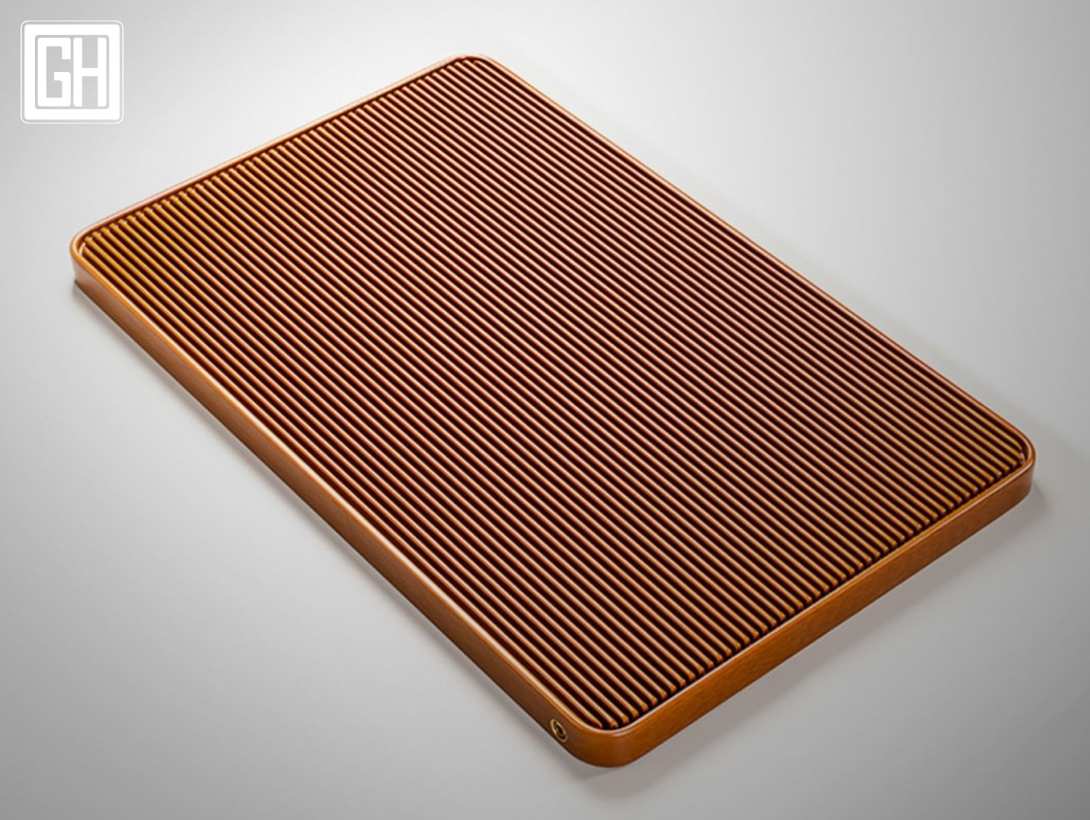Thiết kế tối giản nhưng tinh tế, bề mặt khay được chế tác với các rãnh sọc song song – không chỉ tạo điểm nhấn thị giác mà còn giúp giữ cho bàn trà luôn khô ráo. Nước tràn sẽ nhanh chóng chảy xuống các rãnh thoát, dẫn đến hệ thống ống thoát nước bằng đồng tiện lợi, đảm bảo vệ sinh và dễ dàng làm sạch chỉ trong vài thao tác.